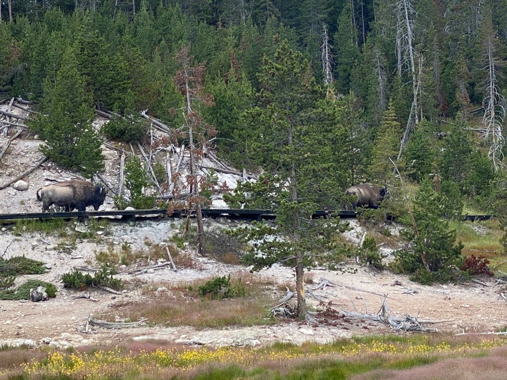 A short conversation with a seasonal Park Ranger would explain-and confuse. Initially it was a question about a closed path at Mud Volcano. Access to the feature we wanted to see was closed. We heard other visitors near the closed entrance saying the reason was vandalism by visitors. This made us mad and sad-why would someone do that (whatever “that” is.) Asking the seasonal ranger about the closure he thought the more logical explanation were Bison on or near the walkway. This proved correct. We went back the next day and found the path open but this time with more rangers than we had seen throughout our visit. We also noticed that Bison were not only lounging by every feature (except Sour Lake,) they had taken over a section of the walkway. I guess the rangers gave up trying to close anything. The next question I had asked the seasonal ranger was were there any rangers furloughed? He was seasonal so it didn’t effect him but he heard some rangers were early on in the pandemic. He also went on to say his understanding was the park was back to full strength now. I asked why then are the Visitor Centers and Firehole river access closed. “Safety” was his answer. I asked if that were true why were the grocery stores/gift shops/snack bars (order in-take out) open? People weren’t having an issue waiting in line and wearing a mask in those spaces. It has become somewhat second-nature for people to socially distance themselves and this was no different. No confrontations, no viral outbursts, just people navigating around each other for ice-cream and souvenirs. After a slight pause “Politics” was the reply. It may be our parks but we don’t get the key.