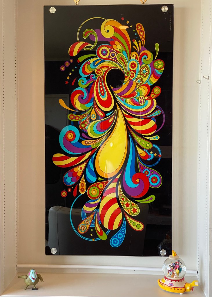 Lisa found this in a thrift-shop for $20 and sent me a picture. I had been half-seriously looking for art to hang in the office and she thought I might like it. I couldn’t afford original pieces and refused to hang cheap reproductions just for the sake of having something, so I just kept my eyes open. This wasn’t a “one-off” or anything particularly valuable, but it did have a cool psychedelic vide so I decided to check it out. I have an ongoing habit of continually updating and redoing my office. Generally it is to redo or organizing the space. After living with the decor for a time, I tire of the layout and/or the clutter and decide to mix it up. In the beginning of the first iteration, I installed every item I had saved over the years. It was easy enough since I had ample room and endlessly adaptable shelves that allowed for everything from an Olympic snow-globe to a custom painted Fender guitar. Later, after finding my father, I displayed many of his personal items that were gifted to me by his surviving sister-in-law Eileen. Once again, an invisible seed is planted and it is time to reimagine the space. The “art” was an abandoned table top in a design discontinued, but perfectly suitable for my needs. The chain of events began trying to determine where it should hang and what needs to head to storage. Sometimes the process is fairly quick and other times it drags on. This time was a 2-day process and only required one box going to storage along with a table. Two other boxes are destined for the shredder and one more found space in an enclosed drawer. I asked Lisa if she had any idea why I continually redid the office to see if she had an answer. “Not really, other than you just want to change it up” was her answer. I’m sure there is more to it and thought deeply about an answer. My conclusion is that perhaps it is the one space in my life that I have control over, so I exert that authority whenever I feel anxious or a little lost. Back to the art. I had already decided which music to play after hanging this piece and christening it into its new home. The first album was Iron Butterfly, the second, Pink Floyd “Meddle” side 2. Maybe if I had all the appropriate equipment, I could stream Hi-Res music instead…, but I doubt it.