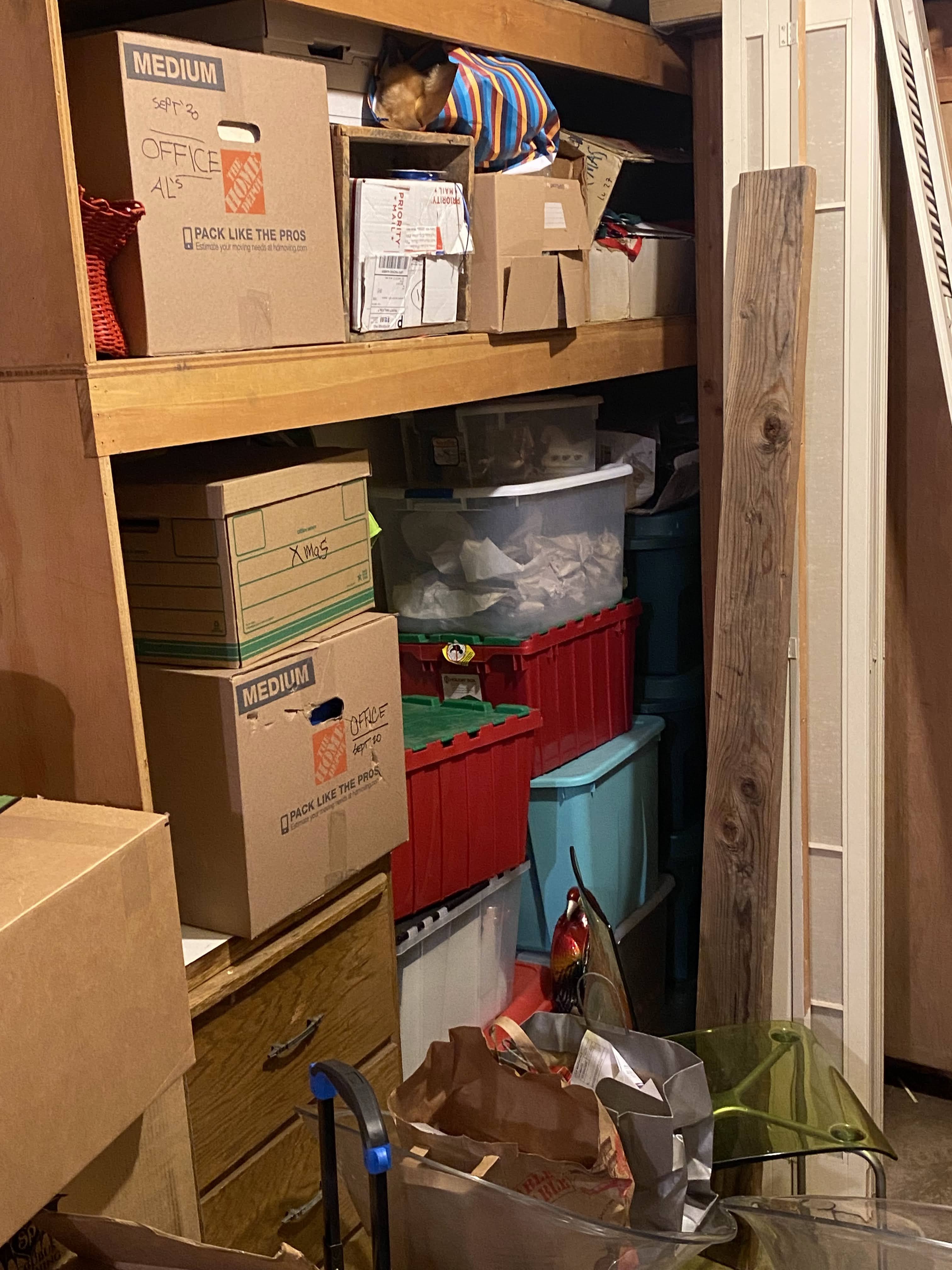 I was Loading up a utility cart with the last remnants of stuff being relocated when I saw the large coffee cup with liquid sloshing around, on the bottom tray. It was wedged between a vase and miscellaneous objects. I remember thinking I hope it doesn’t spill… After multiple trips back and forth between floors, in and out the elevator, objects coming and going off the cart, the inevitable happened and the liquid spilled. An old towel ( already brown ironically) was found and the spill sopped up. The final stop in this journey was the mom’s 2nd floor unit to drop off the last of the purge. It was here I ran some water from the sink onto the sloppy towel and wiped out the last of the coffee residue. From here I went to the basement (again) and deposited the dirty towel in the garbage. Next was parking the cart in its 1st floor parking spot and heading to the elevator. Next stop, 8th floor and home. I replayed this in my mind over and over, repeating it to Lisa. She remembered that cup. She had grabbed it from the garage where I had left it and put it on the cart. Surly the one I had loaded in the washer was that cup. “Fine, but where is your cup?” was my answer. Again, a silly thing but a cup is missing. At this point she understood the weird dilema and started retracing our steps. First was the garage. Nothing. Next the garbage. Had I accidently wrapped in the towel before tossing it? Of course by now there were bags of trash over my towel, but no cup. By the second storage unit I was questioning my memory. I didn’t recall seeing the cup after the spill, so where is it? We had been in the garage, two storage units, and her mom’s condo, so it had to be one of those places. My last stop was where the spill occurred, but no sign…until I looked down as I was closing the storage unit door, and there it was. I had placed it into a odd-shaped gardening bucket along with two plant food containers so it wouldn’t break.